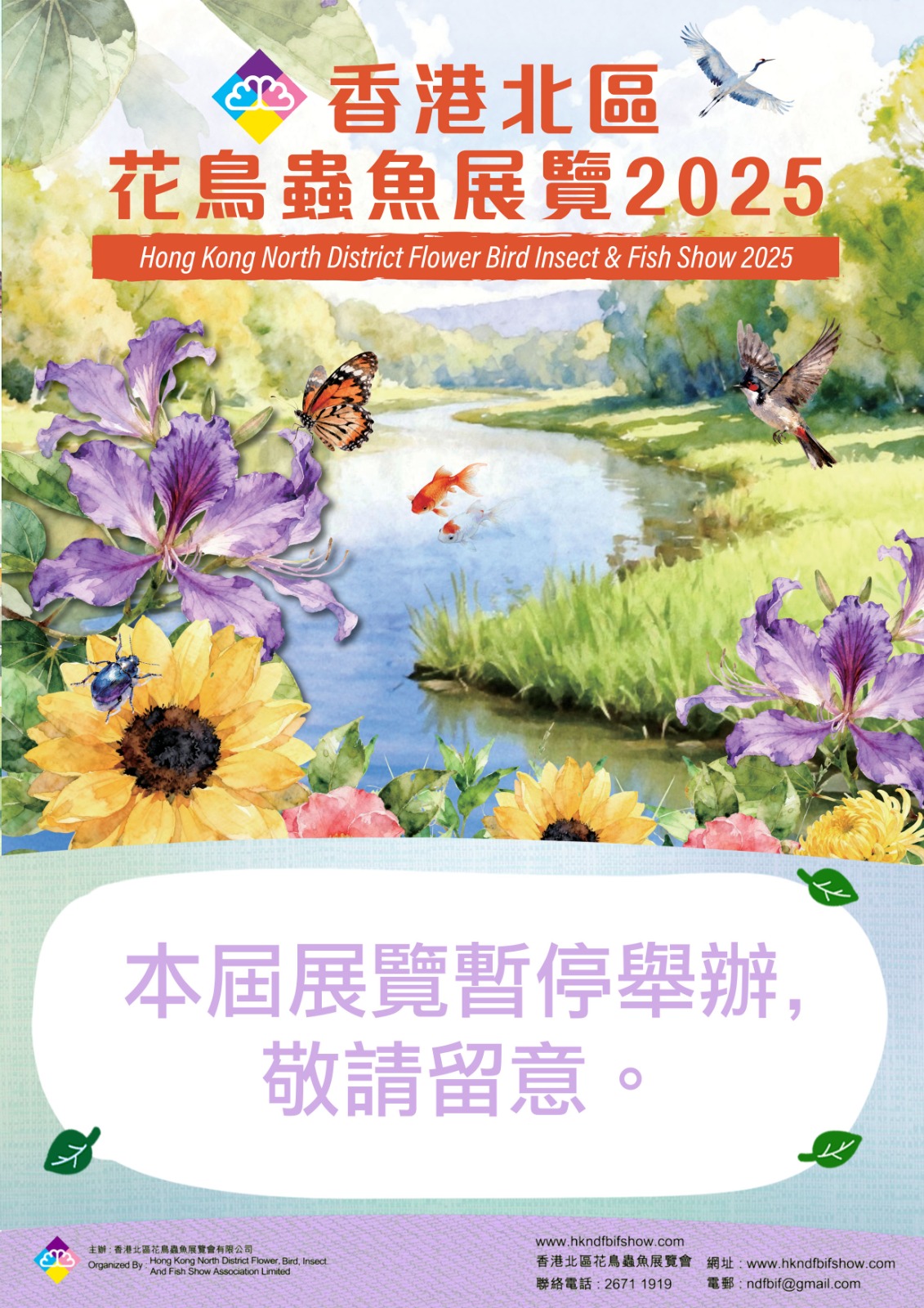 鑑於上月底大埔發生的嚴重火災事故,社會各界正處於哀悼的氛圍中,本會經審慎考慮後,決定停辦原定於2025年12月24至29日舉行的「香港北區花鳥蟲魚展覽2025」。本會對事件深感痛心,並向離世者及殉職消防員致以沉痛哀悼,對所有傷者及受災的家庭致以深切慰問,對所有參與滅火救災救援行動之人員致以崇高敬意。